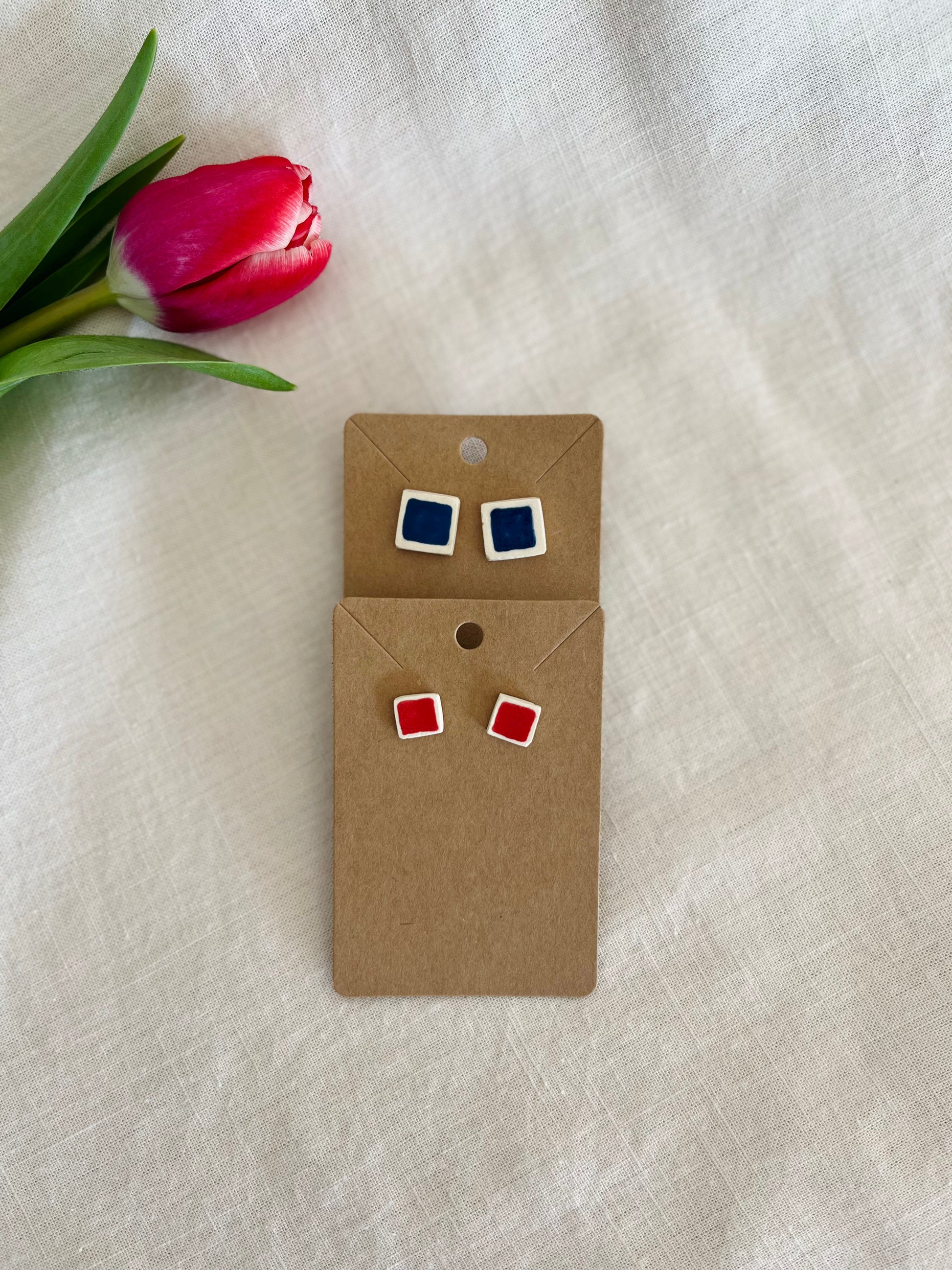 Set of handmade-shaped, painted and fired white clay red or blue block steel stud earring with clear rubber backings. A stylish handmade accessory to add to the perfect fit!