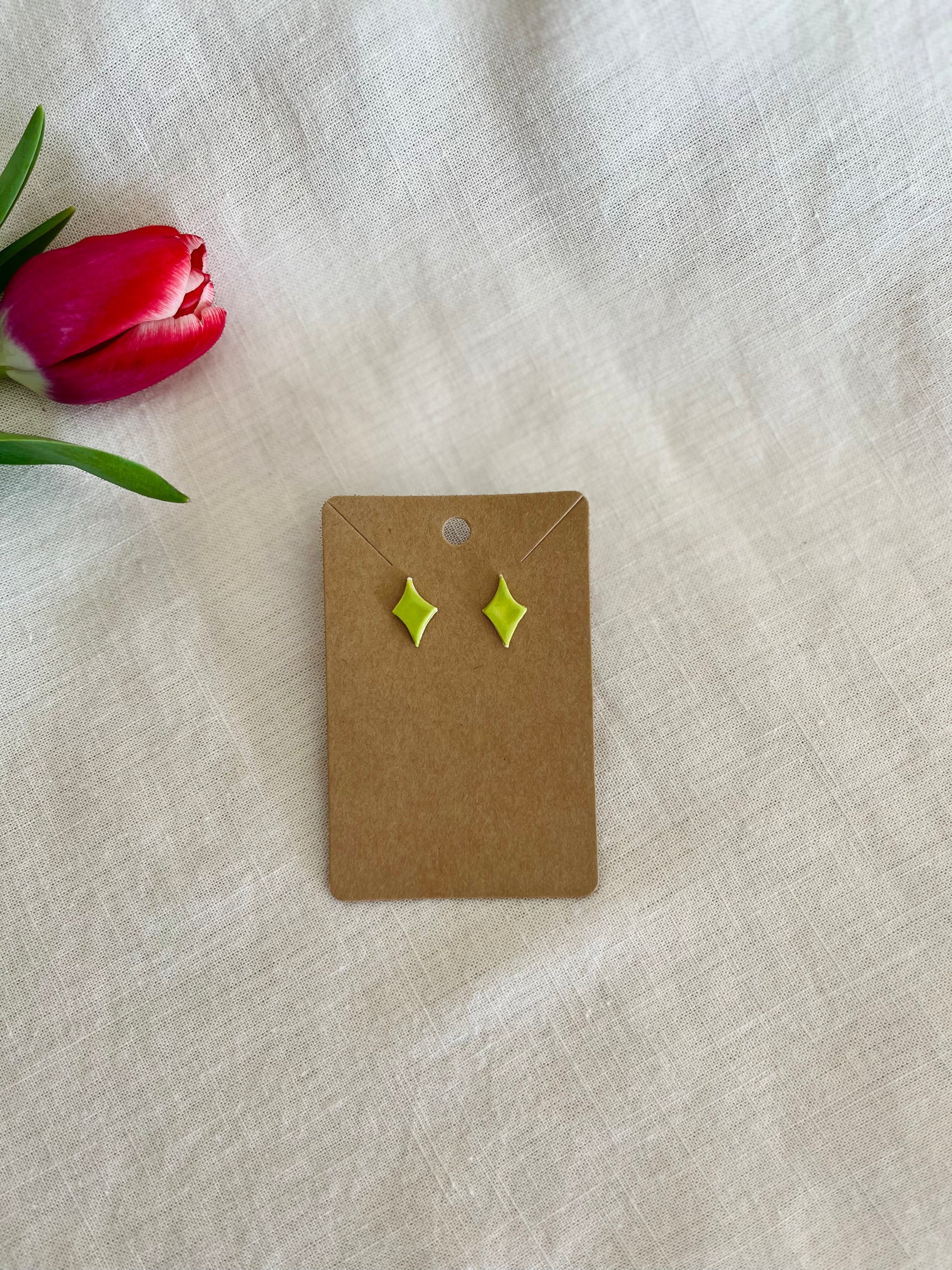 Set of handmade-shaped, painted and fired white clay black diamond or green diamond steel stud earring with clear rubber backings. A stylish handmade accessory to add to the perfect fit!