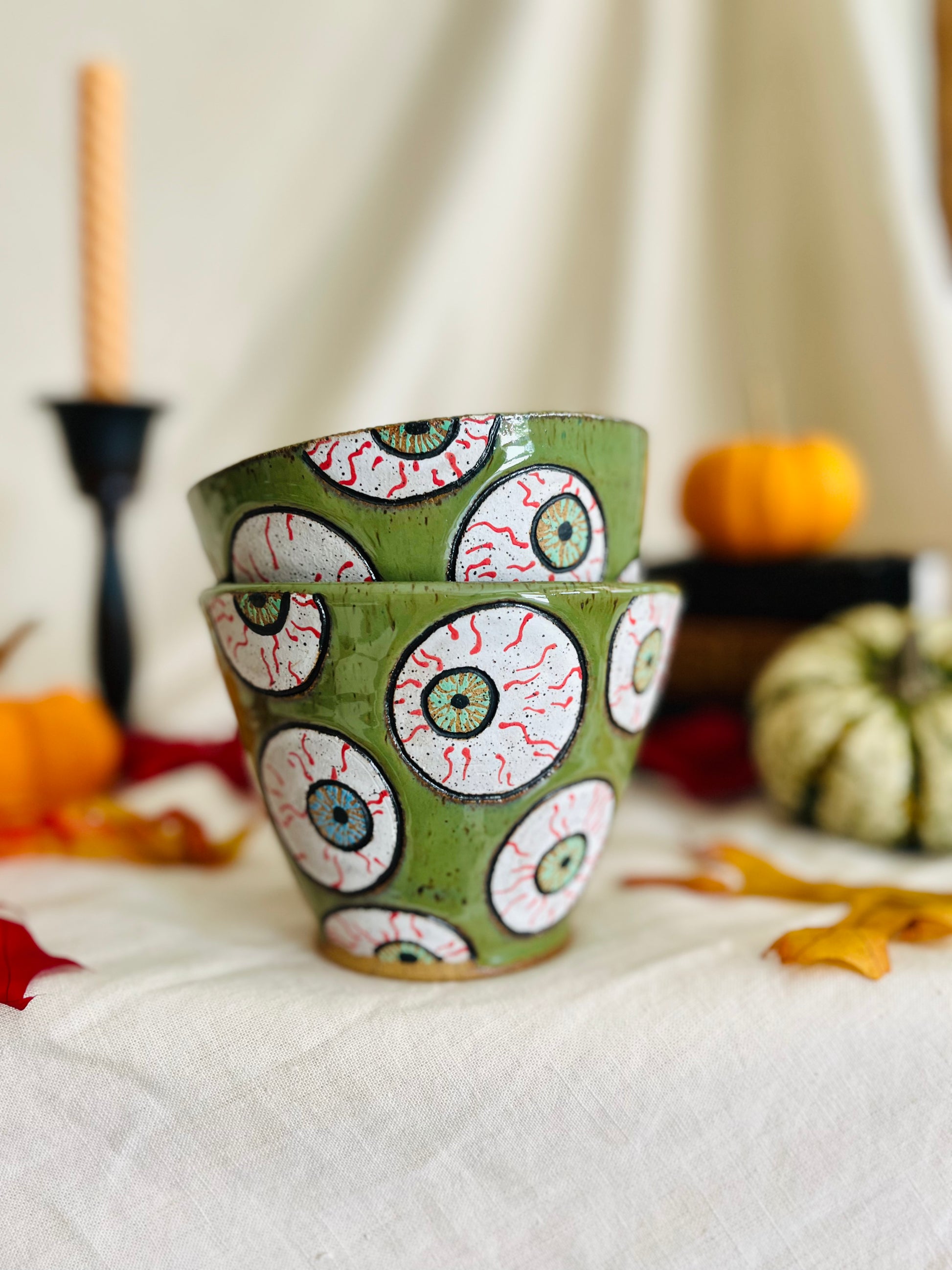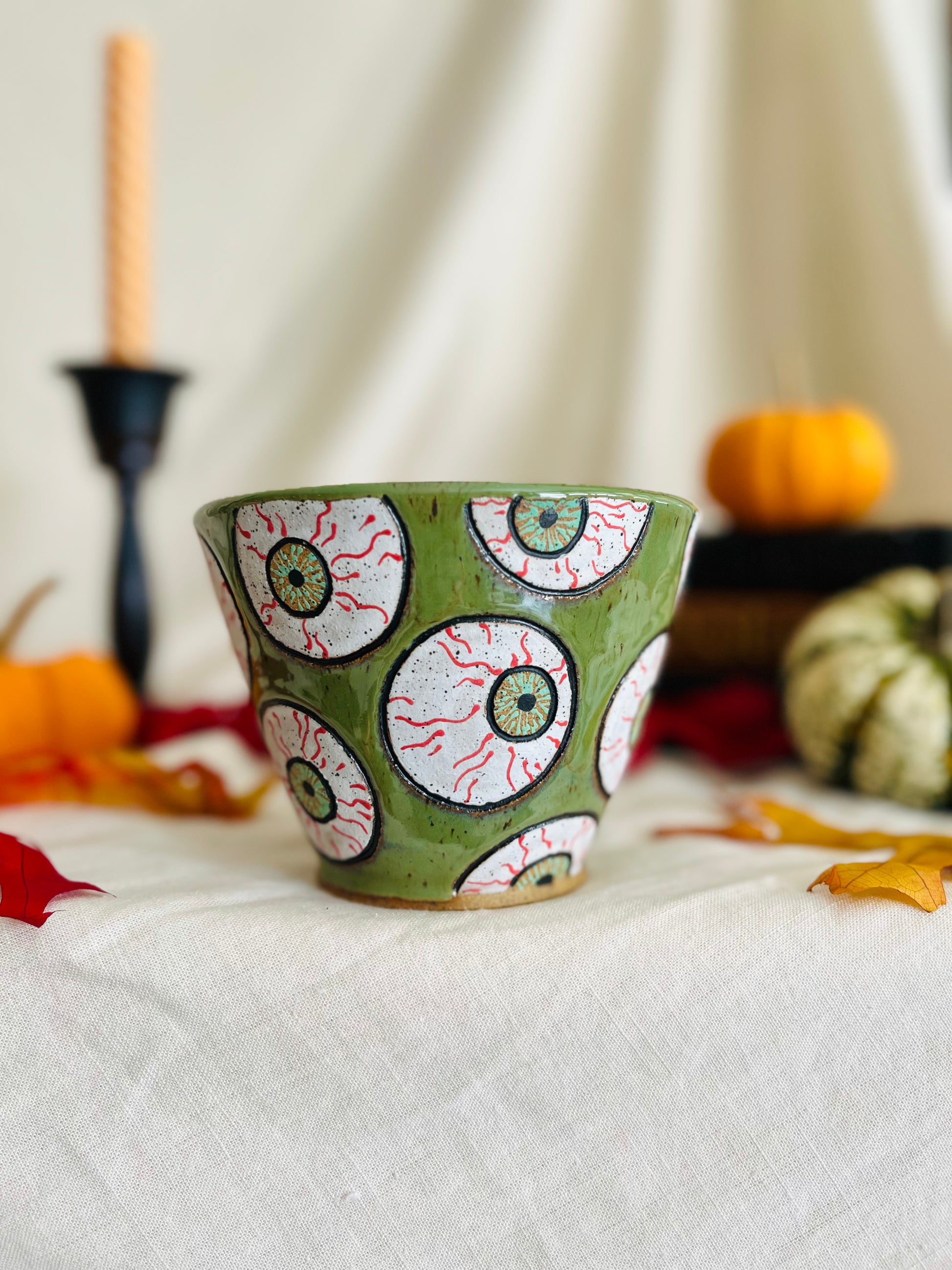 Wheel thrown tall angled bowl with hand carved and painted 'rolling' eyeballs around entire bowl, and finished with a glossy green glaze. Perfect ramen-or snack bowl!