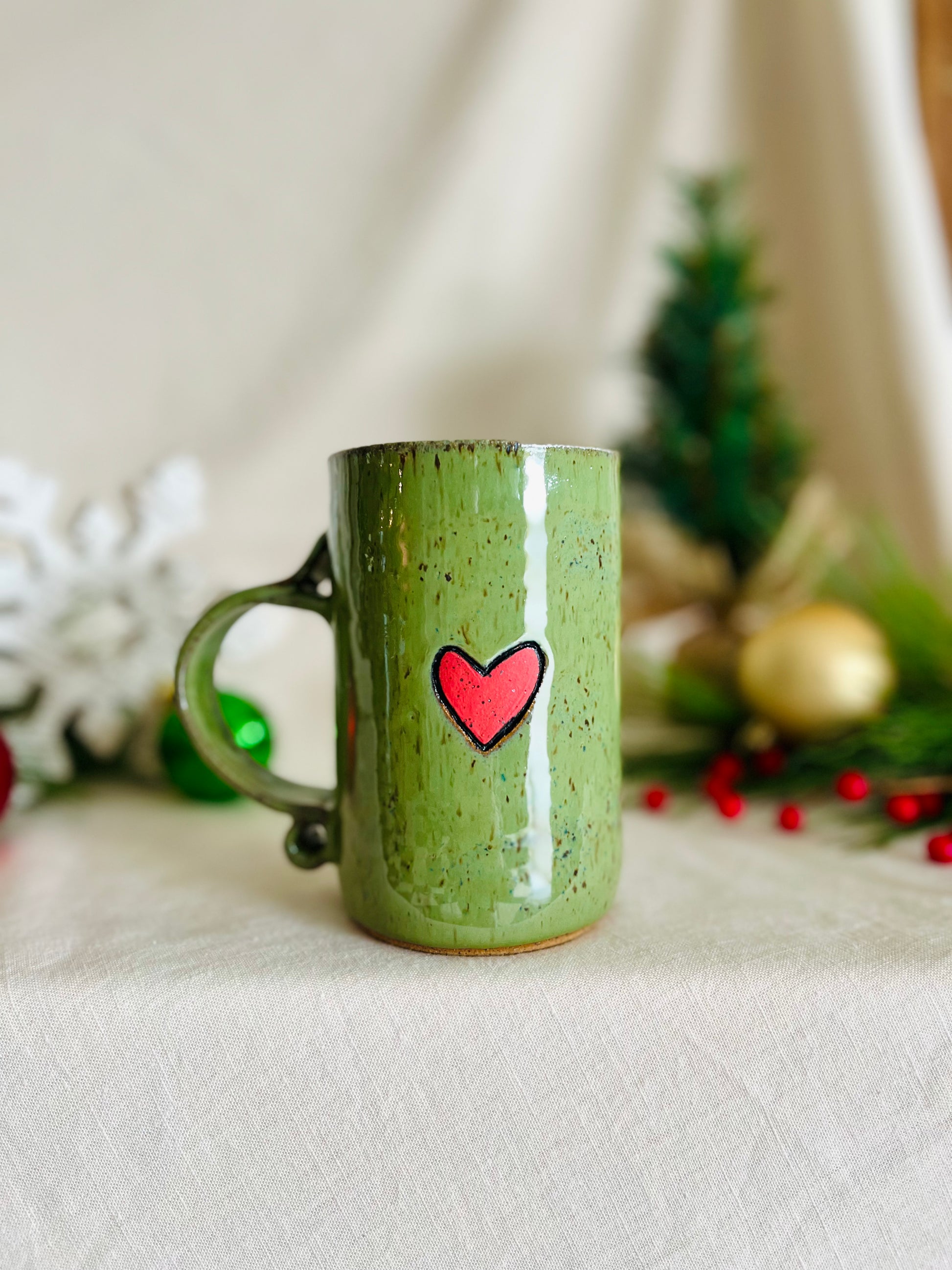 "you're a mean one" Wheel thrown mug body with pulled and sculpted curly handle and individually hand- carved and painted Grinch face in front, and his heart on the back of the mug, finished with a glossy grinchy green glaze. This silly-spirited mug is created to spark your favorite Grinch memories each time you sip!
