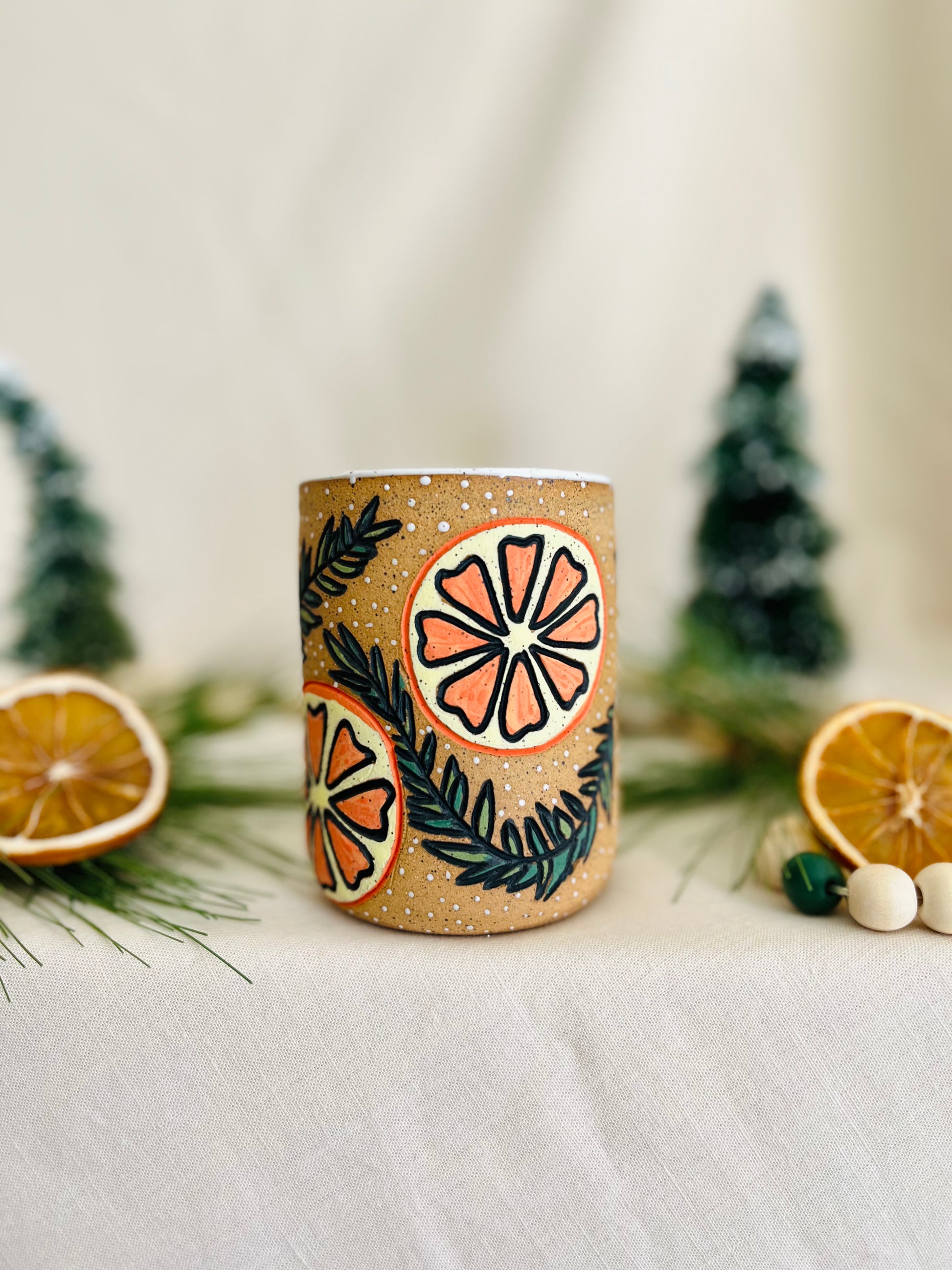 Wheel thrown cup with hand carved and painted orange slices and rosemary scattered around entire cup and finished with a glossy white glaze inside the cup.