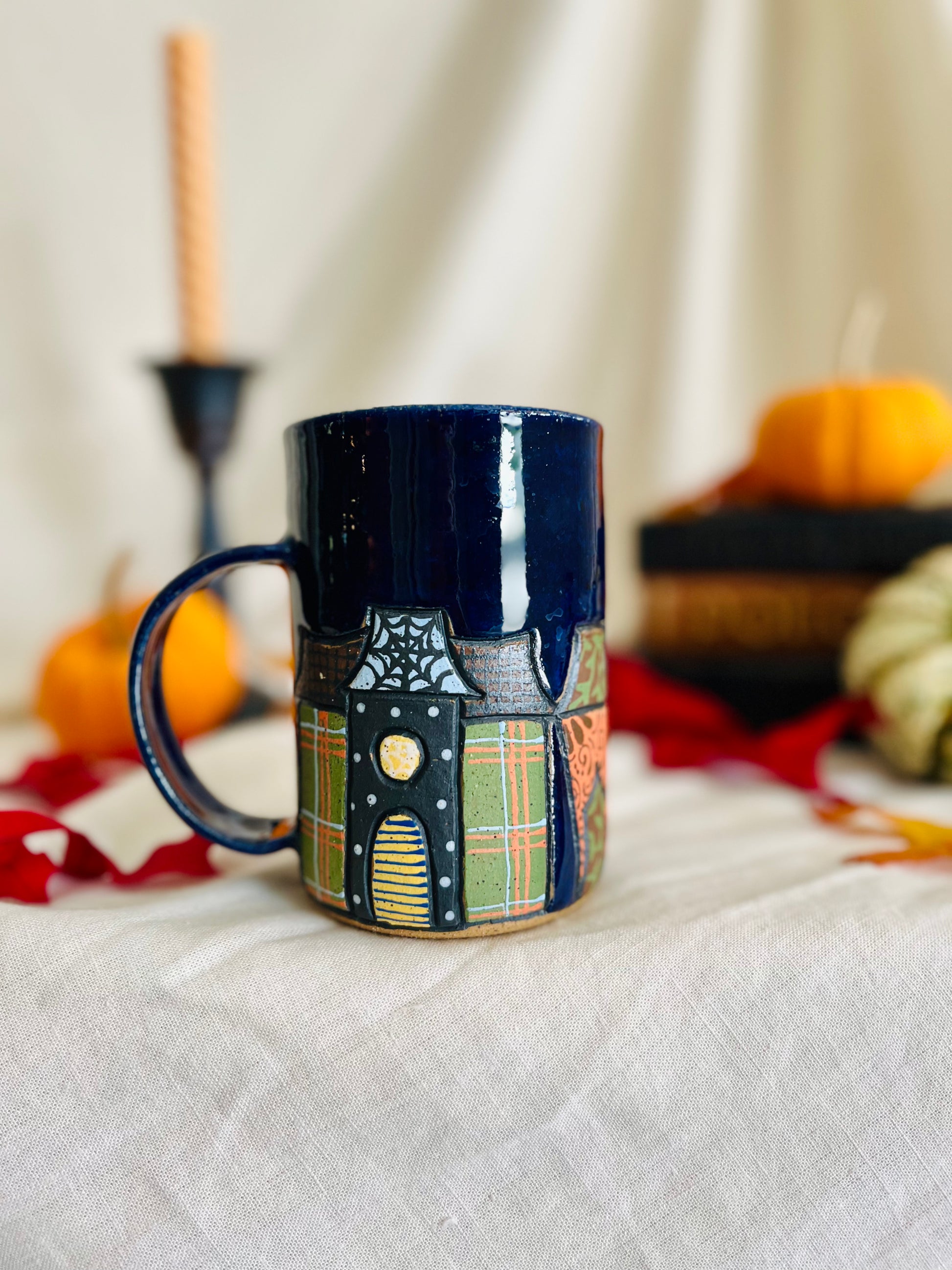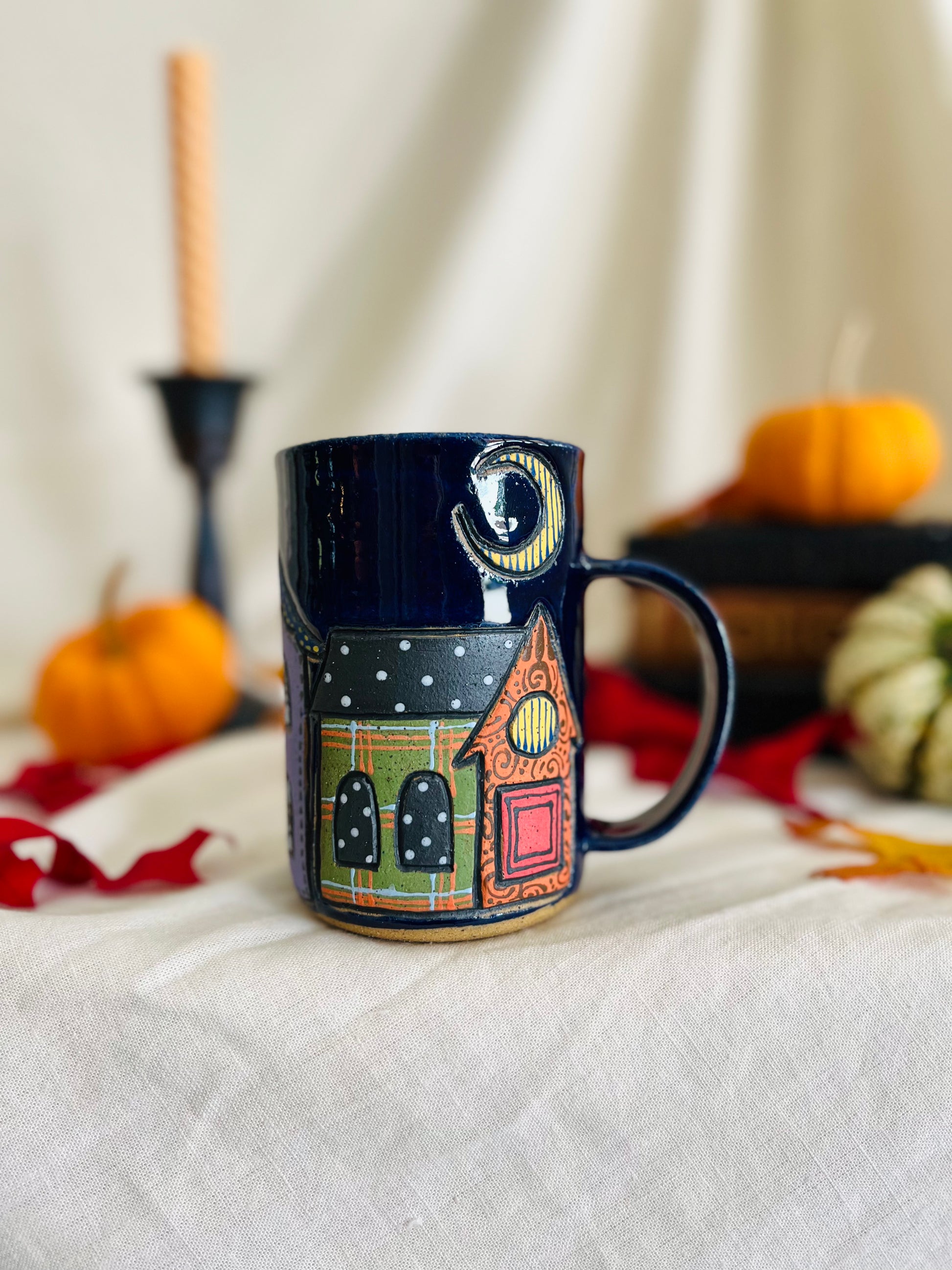 Wheel thrown mug with pulled handle, hand-carved and individually painted colorful patterned patches shaped into a crescent moon and spooky haunted houses around entire mug, and finished with a glossy midnight blue glaze.