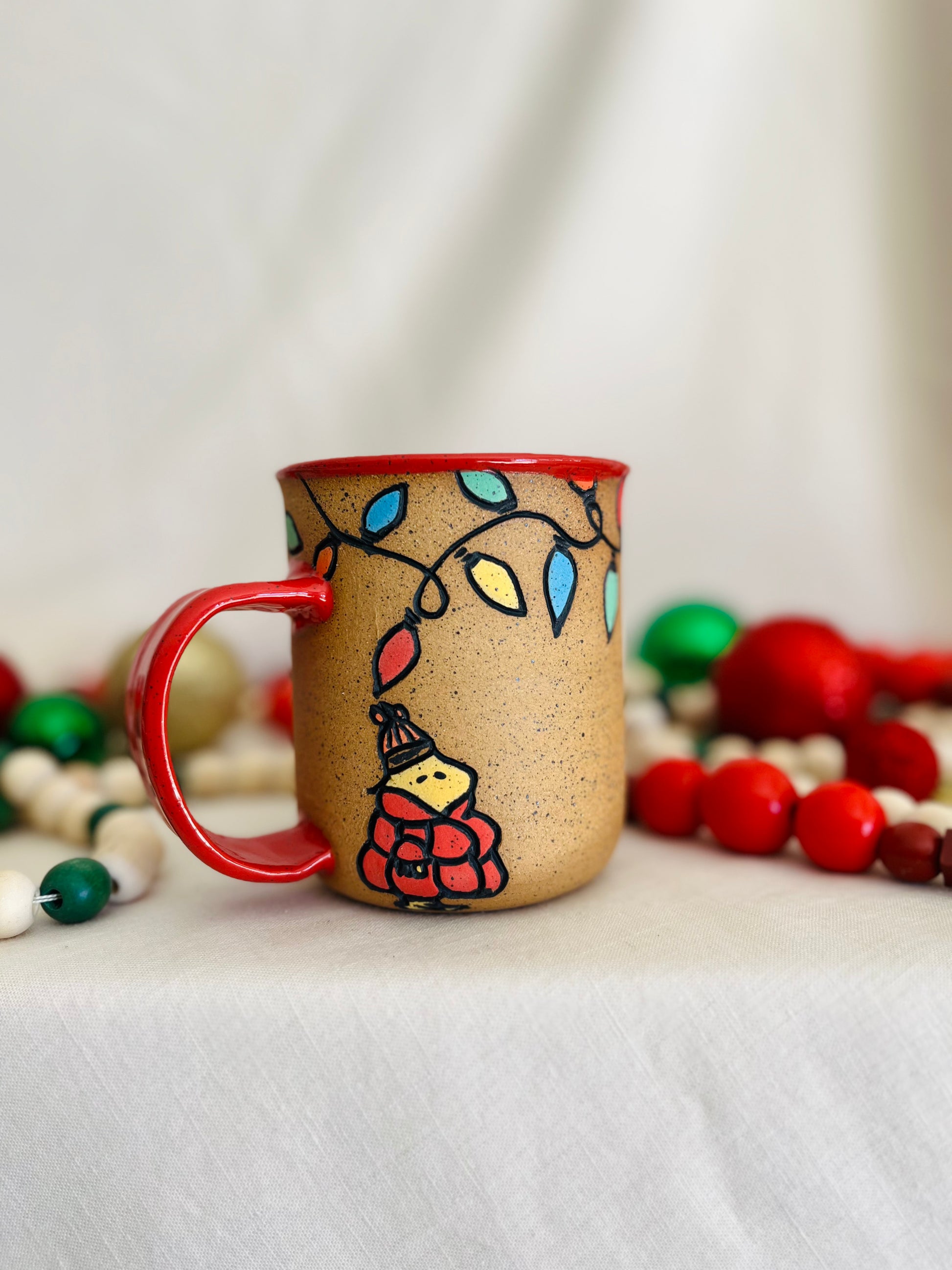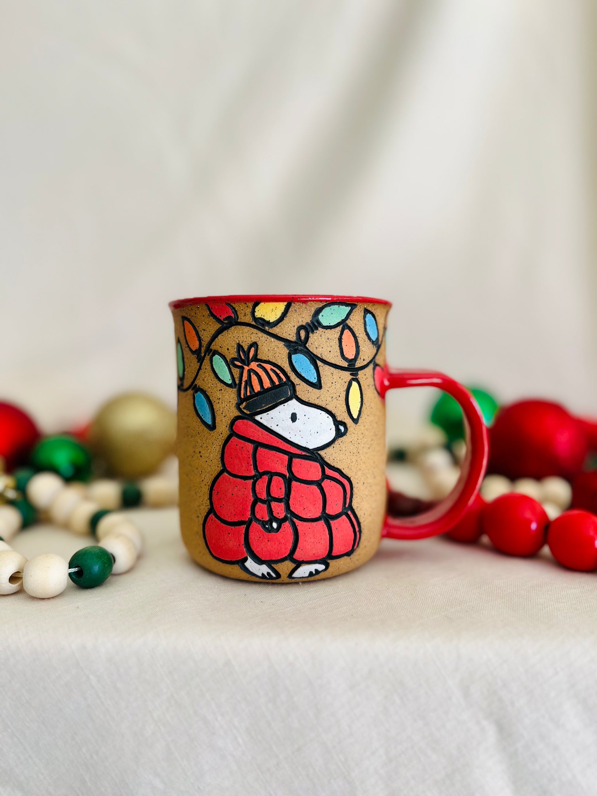 Wheel thrown mug with pulled handle and hand carved and painted puffer Snoopy on front and puffer Woodstock on the back of the mug, with colorful string lights strung around the top of the mug, and finished with a glossy red glaze inside and on the handle of the mug.