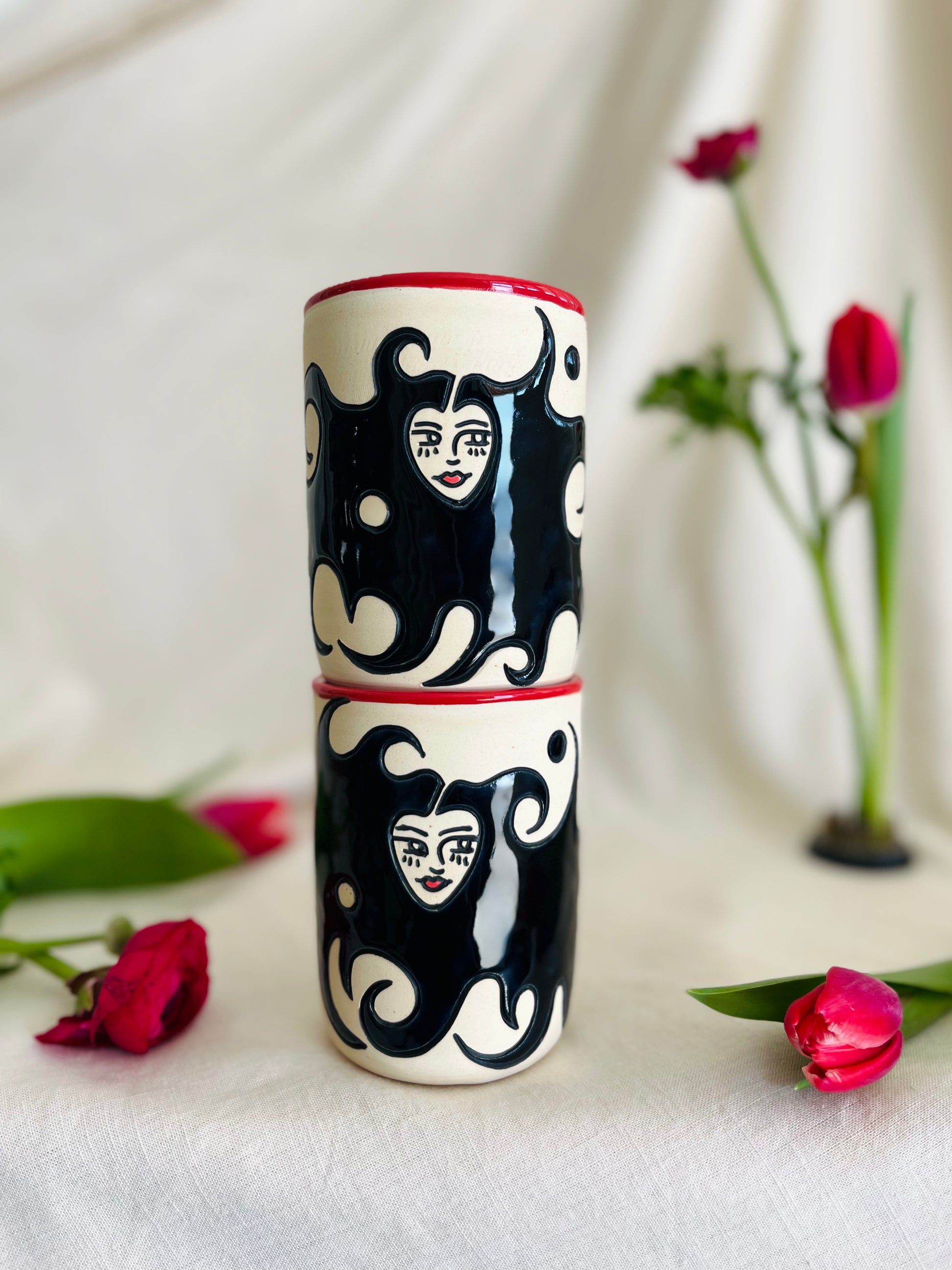 Wheel thrown tall white clay cup with carved and painted lady head with curling glossy black American traditional tribal-style hair wrapped around the cup, and finished with a glossy red glaze inside the cup.